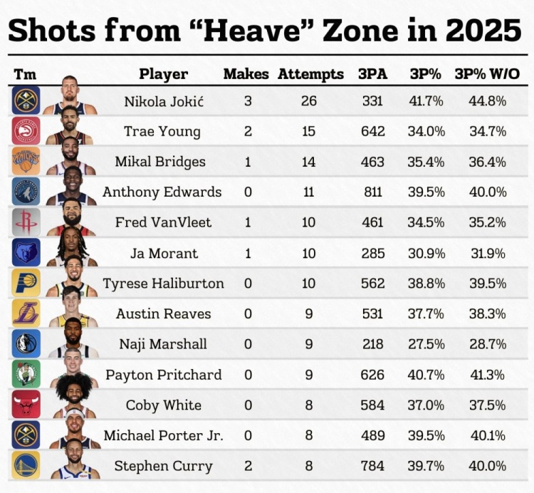 这条规则现在在夏季联赛试行,未来可能会在NBA应用,对于提升比赛的精彩程度来说是有利的,对那些在比赛中承担超远压哨投篮任务的球员来说也是好事。今天,老震为大家盘点一波上赛季出手这种投篮(heaves出手)最多的一些球员,看看刨掉这些出手,他们的三分命中率会提升多少。